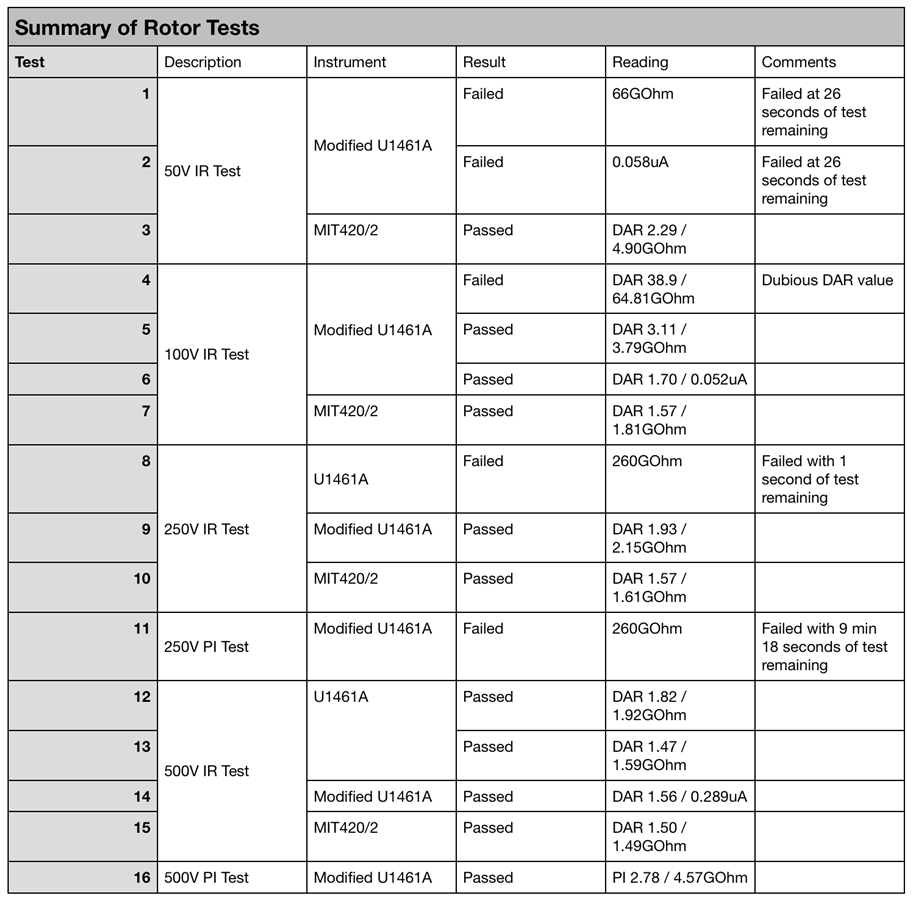 The modified unit supplied by Keysight was tested against both the original unit and the Megger MIT420/2MIT420/2 Initially DAR tests were carried out at various voltages and then some PI tests were carried out at 250V and 500V
