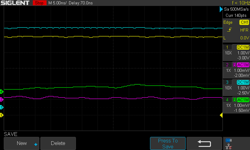 Channels 1 Yellow and 2 Pink are YAPS; 3 Cyan and 4 Green are Tenma. 2 and 4 are measuring AC noise. Measured values, Pk-Pk are: