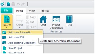 We’ll now proceed to add a new schematic file into this project to “draw up” our circuit on an A4 size sheet. Click on “Project” and “Add a new Schematic” into the project.