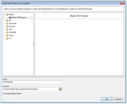 Start a new PCB project from File → New project → PCB project. I’ll choose a “Blank PCB project” type and give it a name “LED_Flasher”.