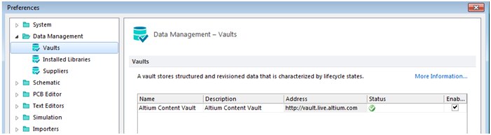 Oh, and by the way, if a vault is not installed already with your installation, you can manually add a vault from File → System Preferences → Data Management → Vaults → Add Altium content vault and use this URL: http://vault.live.altium.com and tick the “Enable” box. Like this below: