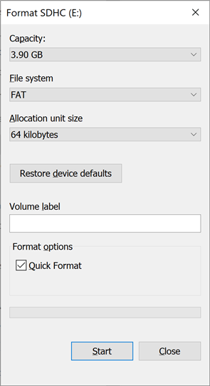We can then use the windows to format it with FAT (note, not FAT32) as the screenshot below