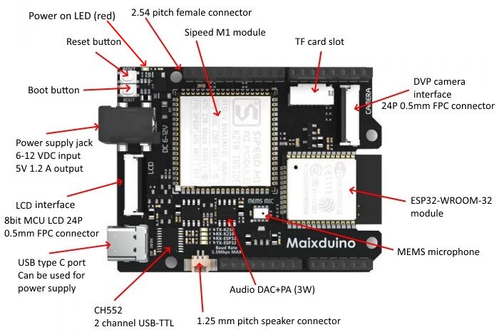 Maixduino development can be made with a variety of IDE such as MaixPy IDE (MicroPython), Arduino IDE, OpenMV IDE, and PlatformIO IDE. It supports Tiny-Yolo, Mobilenet and TensorFlow Lite deep learning frameworks with QVGA @ 60fps or VGA @ 30fps image identification.