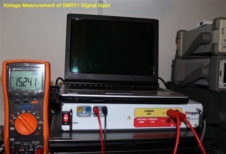 The Megger SMRT1 unit was the next to be tested. The manufacturer does not provide much information on the digital input. It does have the ability to work with either voltage present or voltage free contact on the relay with an input voltage between 5 and 300V AC or DC. I decided to try and measure the input resistance of the SMRT1 whilst it was energised with a multimeter set to ohms range. To do this the digital input of the SMRT1 needs to be configured to respond to a voltage applied to it and not its default state of a lot free contact when it outputs 15V to detect the contact closure.