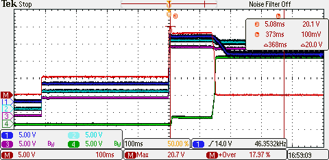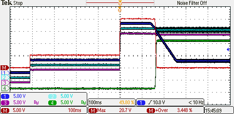 The 1st step to 5V is the initial USB power up, the trigger point is the successful power contract negotiation (blue,light blue and purple trace rise to 20V) and~140msec later, the FETs finally turn on(green trace starts raising) and the input voltage drops slightly because of the 4.85A current draw.
