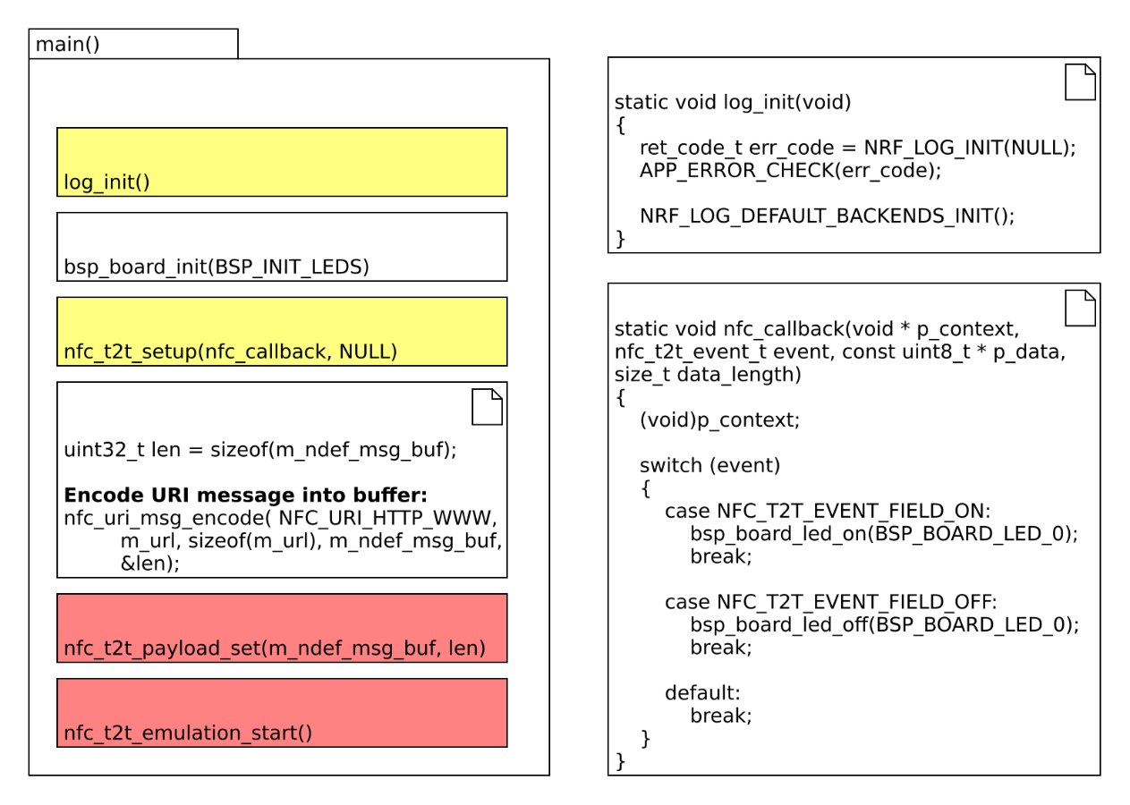 The main routine includes a number of functions of which only two can be directly modified within the main.c file. These being log_init(), which is just for debug messaging and the other being nfc_callback(), which handles all the NFC events. The function bsp_board_init() is found within the “boards.c” file, which is a common library file linked to the hardware rather than the app itself. Then there are 2 other functions, nfc_t2t_payload_set() and nfc_t2t_emulation_start() which is from a precompiled nfc library module for type 2 tags (named nfc_t2t_lib_gcc.a). So we don’t get any visibility on that code.