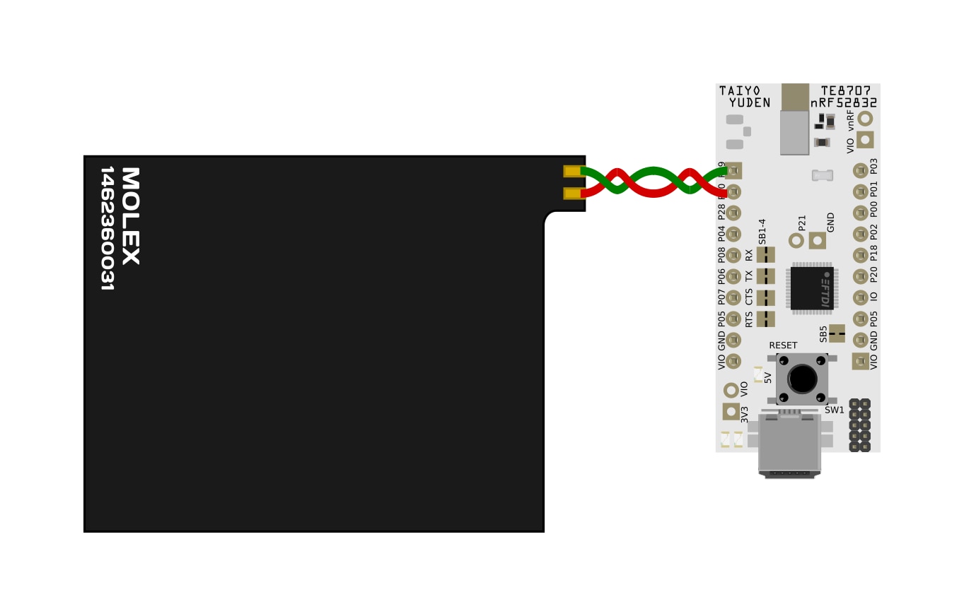 Connecting the NFC antenna to the EBSHSNZWZ board is dead simple as it connects directly onto pins P0.09 and P0.10.
