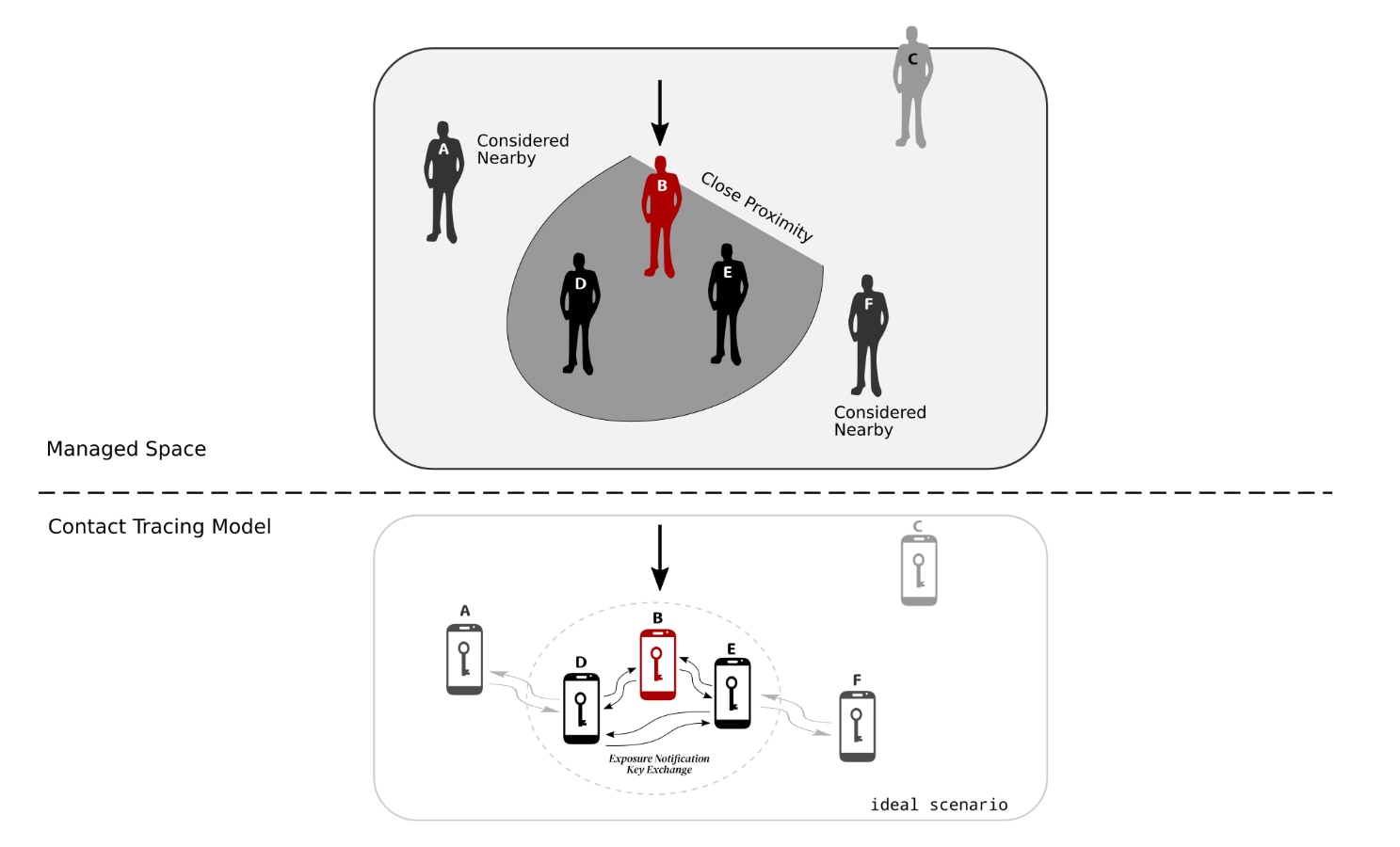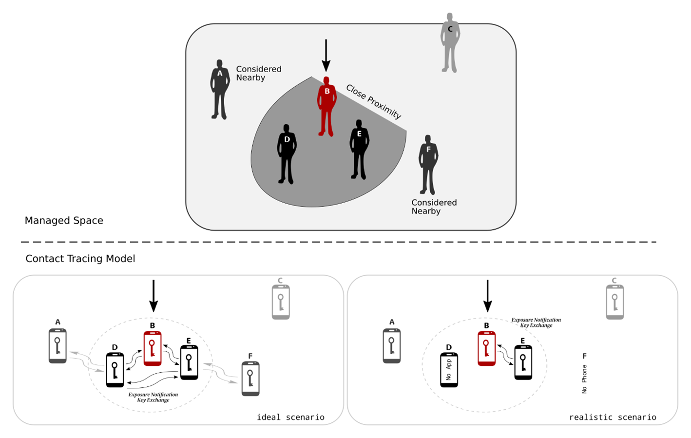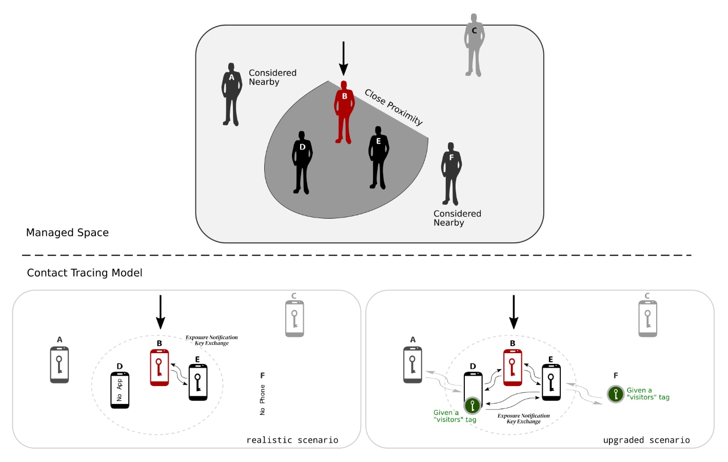 The basis for the Contact Tracing Model is that a person typically carries their phone around with them and thus the phone can be used as a proxy for that person. Bluetooth Low Energy is used because most modern phones now incorporate a a Bluetooth Low Energy transceiver. These transceivers not only provide short to medium range wireless communication between phone and a peripheral device but can also control the strength of a transmitted signal as well as measure the strength of signal from the transmission received. With a bit software and knowledge of these two parameters one can approximate the distance between the transmitted signal and where that signal was received. Thus phones can be used to approximate the distance of two people.