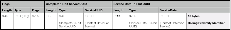 The Advertising Service Data broadcasted with this service UUID contains a 128-bit (16 byte) Rolling Proximity Identifier, which will change periodically. Both the advertiser MAC address and the Rolling Proximity Identifier changes synchronously so that the phone cannot be tracked by linking previous transmissions.