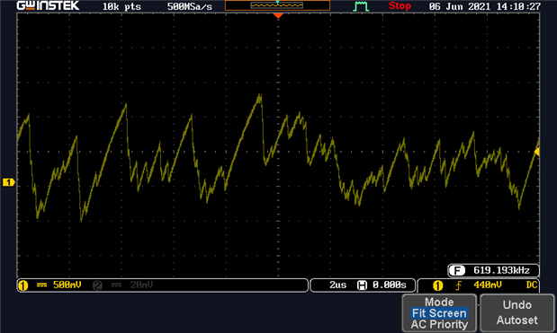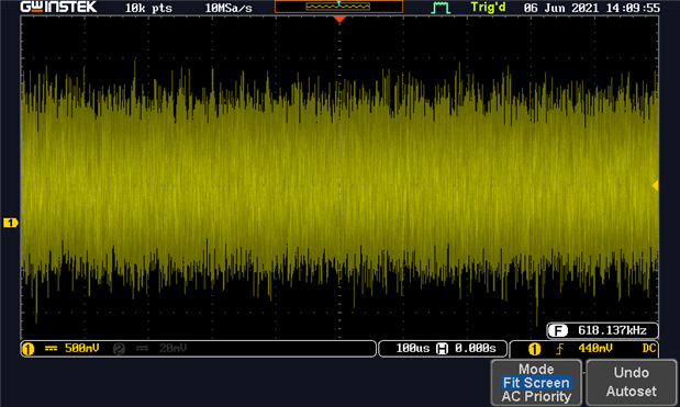 At lower frequencies (the scope is AC-coupled for these), the noise looks quite noise-like. Like this: