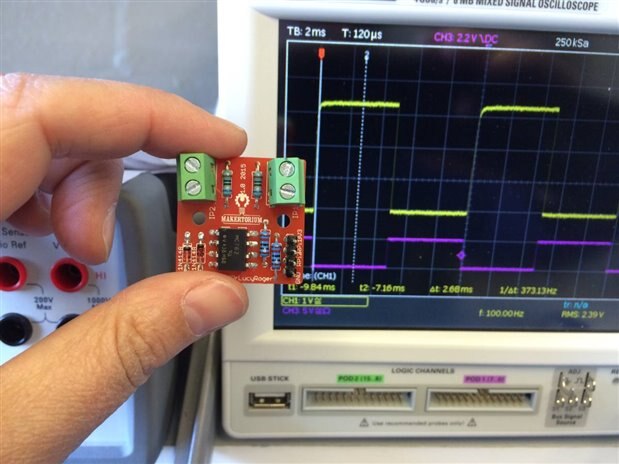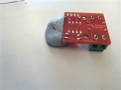 The photo below shows the optoisolator in the top left corner of the Firecrackers control box (the three other orange PCB's are the Thingatrons).