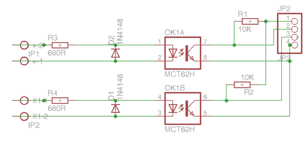Finding which parts to use and their corresponding items in the Eagle libraries was still the most difficult part. I used a dual-channel optoisolator (photo below), which means there are two LED's and two transistors inside the one component - therefore I could run two inputs through one PCB.