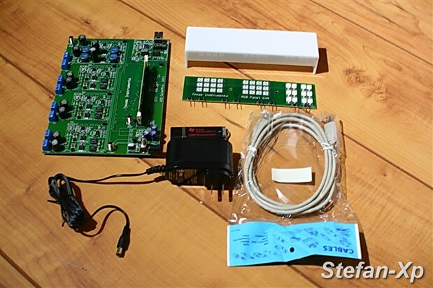This is the content of the Kit without the Woodware :-). On the left the "Mainboard" with controllercard inserted, then clockwise: LED-Difusor, LED-Strips, USB-Cable, Power Connector... :-( ... , USB-Drive.