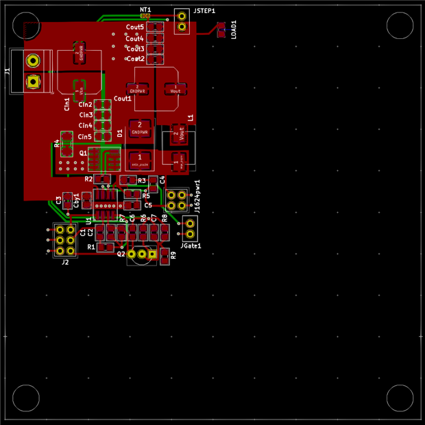 - Layer 2 is a Shield Ground which connects solely by the -Ve PCB terminal for Vin. There are no other connections to this layer. However, there are vias and through-holes plus the two high current traces that needed to be routed off the top layer. There is also a Keep-Out underneath the Inductor (L1).