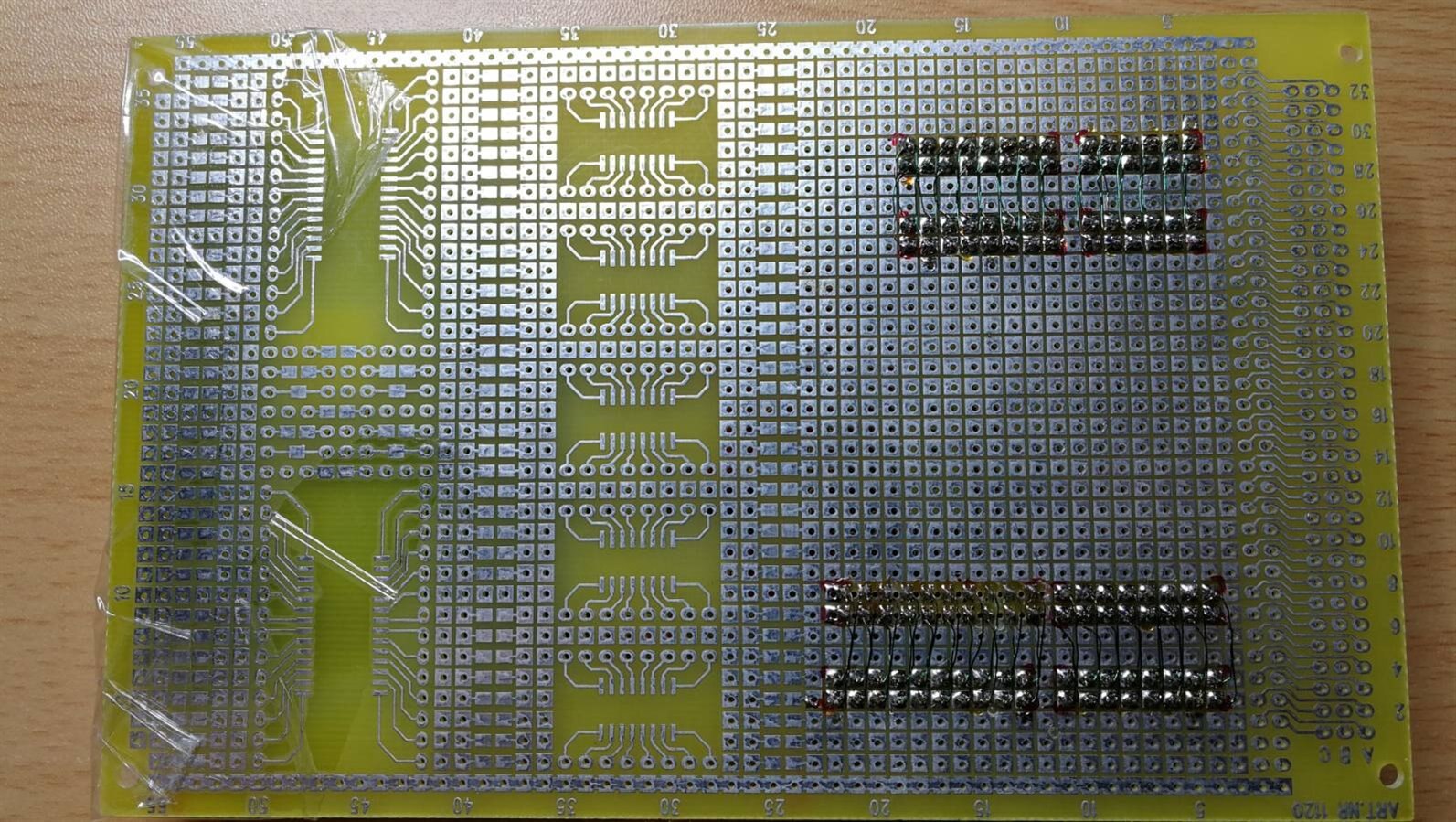 Strip board implements this paradigm by including all the traces on the bottom of the card running in the same direction and has all the vias pre-drilled to allow jumper connections across traces. In practice, through-hole components bridge between traces, so very few jumpers are actually needed. Basically all nets have a horizontal trace or section of a trace on the bottom of the card and all components are installed vertically between these nets. It can end up looking as neat and almost as dense as a custom double-sided PCB. It takes some planning to efficiently use the horizontal traces on the bottom and minimize vertical jumpers, but the result can be a very clean circuit card. For example the power and ground nets are generally horizontal traces that run the length of the card. Many components directly connect to these bus bars. Also if there are busses involved they are already built into the strip board.