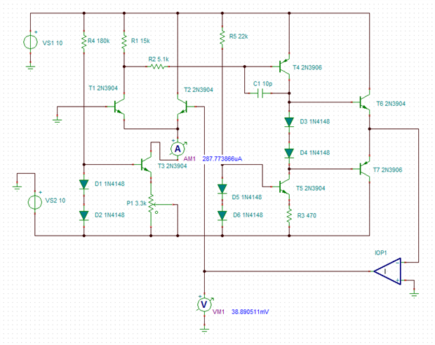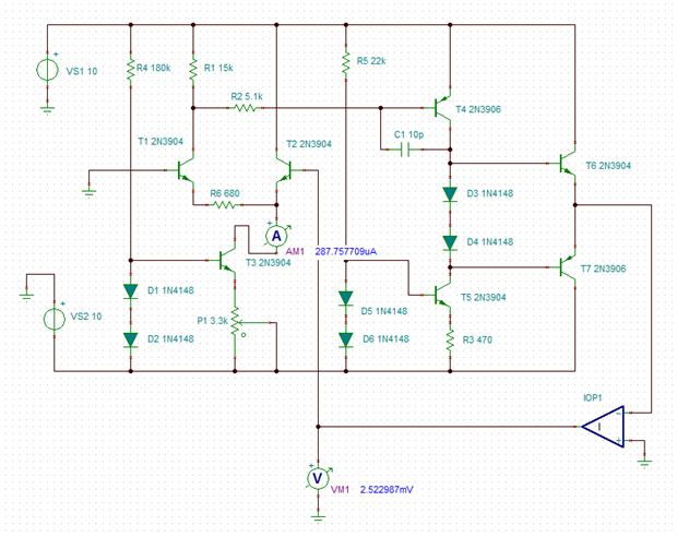A few weeks ago I came across a series of YouTube videos by the IMSAI Guy on an op-amp made from discrete components. Over a series of posts he describes the circuits that make up a basic op-amp and demonstrates them on a bread board. I found this very interesting and proceeded to build one myself. It was to going to be a one or two night affair that has stretched into several weeks. The issue has been a combination of being away from home for large stretches of time and not being able to concentrate on it, the desire to dig into it more deeply than the videos, and the complex behavior of even this simplified op-amp.