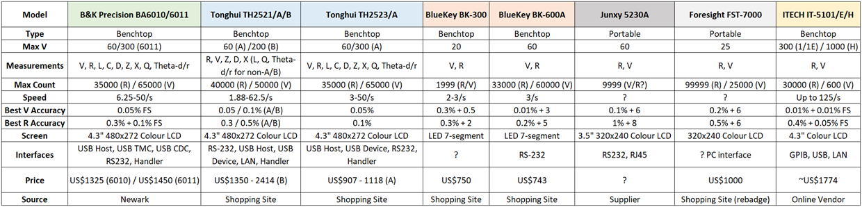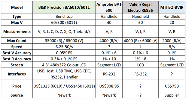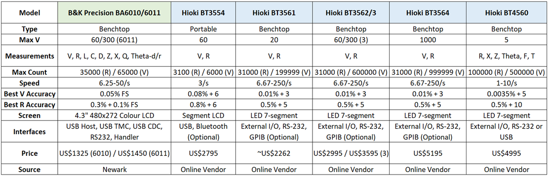 We begin by comparing the BA6010 to the options provided by the more established test equipment providers. The BA6010 is already off to a good start in this first table, being the most inexpensive of all options while offering the more measurement modes, faster measurement times, better accuracy than most and a larger screen. The only other benchtop competitor, the GW Instek GBM-3080/3000, seems to slightly beat the BA6010 on voltage accuracy and resolution but at a cost of nearly twice as much. As the other units are portable or handheld units, their lower accuracy is not unexpected as they are more suited for field applications.
