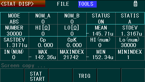 The statistics mode deviates from the other modes in that the statistical parameters are set within the statistics display itself rather than through a dedicated settings page. Up to 30,000 readings can be used for the in-built statistical calculations, with the possibility for manual triggering. In my experience, while the mode did work and could be of use in standalone use, if a PC were available, directly analysing the raw data over the remote-control interfaces may prove more instructive.