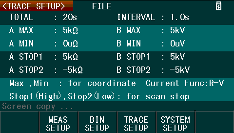 The Trace setup menu allows for configuration of the parameters used for the trace display mode. Unfortunately, it seems this mode is rather limited, requiring pre-configuration of the maximum and minimum values for each of the measured parameters and total record lengths/intervals prior to use. Redefining these values after a collection has started seems to reset the collected trace data. The trace mode also allows for configuration of value “boundaries” which will stop the trace scan feature.