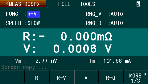 The measurement display is the main display you would use when interactively using the device. This mode resembles the display you might expect to see on a benchtop multimeter, showing the measurement parameters and measurement values.