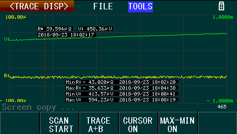 The trace display allows for monitoring values as they change over time. Provided appropriate limits have been configured in the Trace setup menu, the scan can be started from the Trace display. A cursor and Max-Min data display are available.