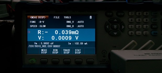 Measurement of low resistances requires more than just Kelvin connections, as there are also other sources of error such as thermal EMFs which can develop at the interface of dissimilar metals – an effect exploited by thermocouples. To ensure the highest measurement accuracy, the BA6010 is capable of nulling out the zero-resistance point by performing a calibration procedure with the clips shorted together.
