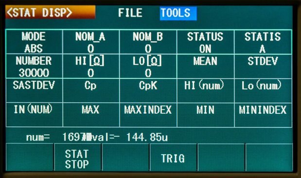 The unit offers an array of measurement modes which include R, R-V, V, R-Q, L-Q, L-R, R-X, C-D, Z-θd, Z-θr and R-C. In the measurement display, it behaves similar to a multimeter, displaying measurement values and measurement parameters. In the Bin mode, it categorises the tested sample based on the measured value. In the Trace mode, a rudimentary graph of the measurement can be built up over time. Finally, in the Statistics mode, statistics on a number of readings can be computed within the instrument.