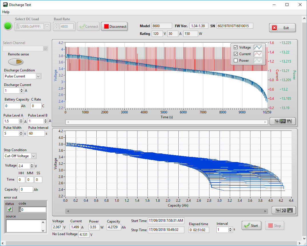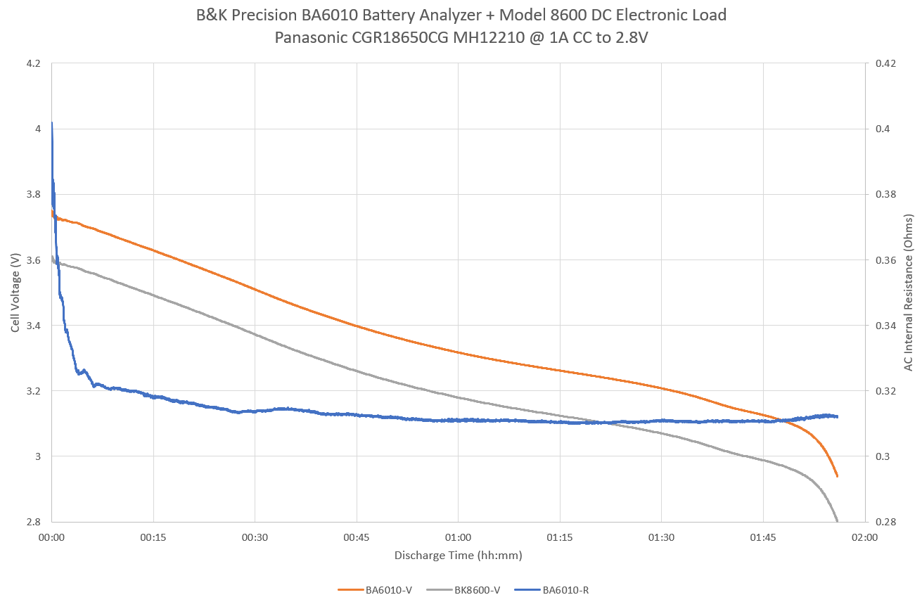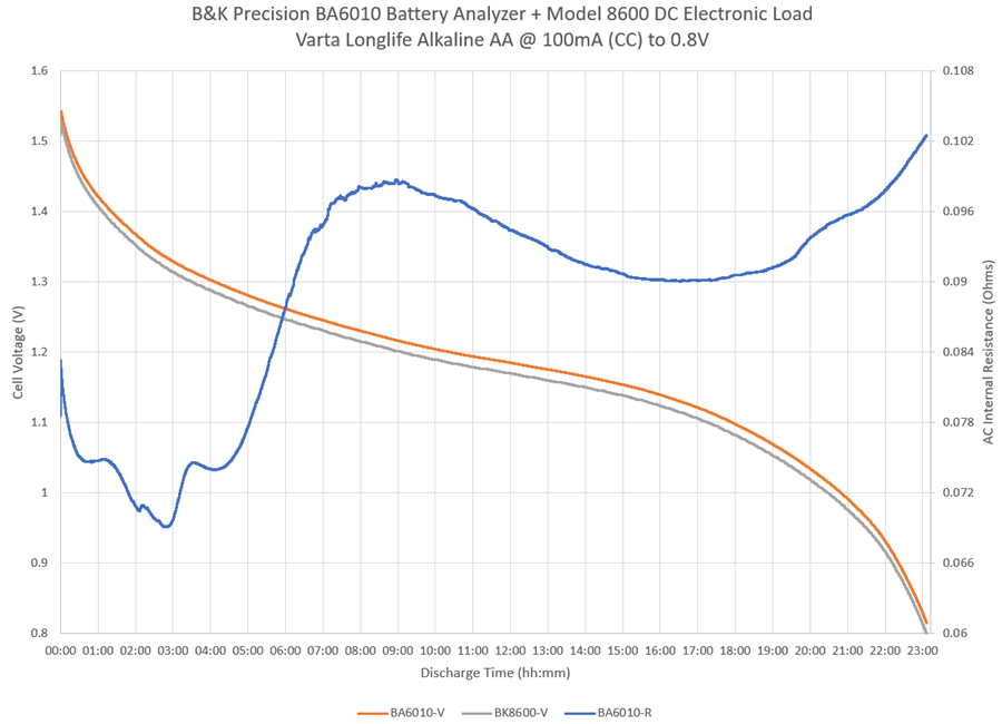 To understand how the AC internal resistance evolves, batteries were tested with the B&K Precision Model 8600 DC Electronic Load configured to run a standard discharge test while the B&K Precision BA6010 Battery Analyser simultaneously measured the AC internal resistance. The discrepancy in the voltage values in the plots are due to running the B&K Model 8600 in two-wire mode, owing to the limited amount of connection space on the terminals of some of the tested batteries and to simplify set-up. The voltage difference represents the voltage drop along the load-wires.