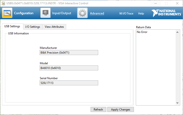 The final mode that is supported is USB TMC (or Test and Measurement Class). This is a specific mode of operation intended for test and measurement devices as a “replacement” for GPIB. To use a device in TMC mode, users must first install a VISA layer which has IVI drivers bundled with. The most popular VISA layer is National Instruments VISA (NI-VISA) and is the one recommended by B&K Precision.