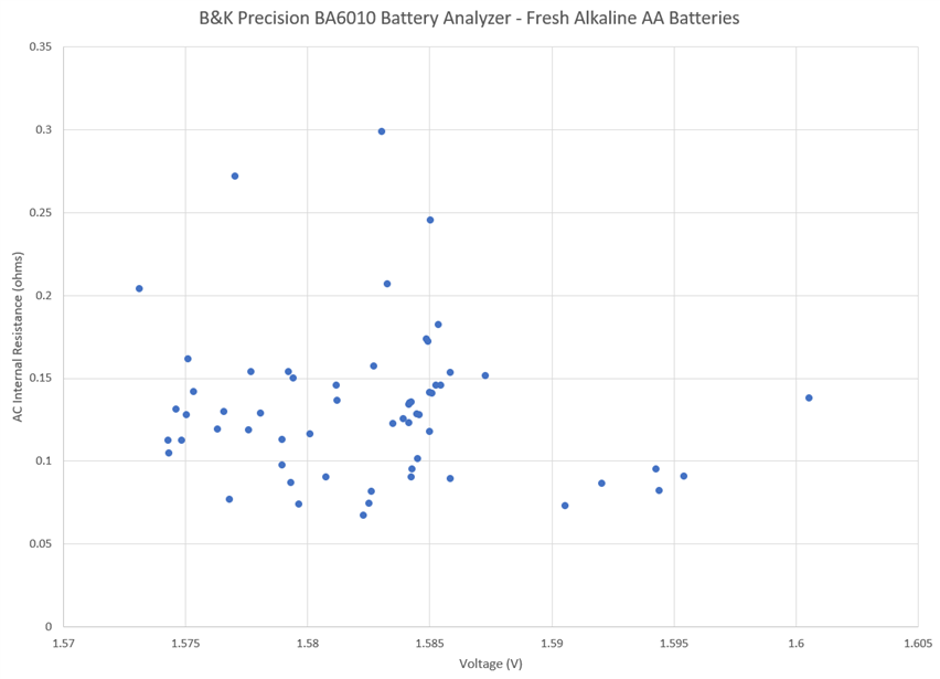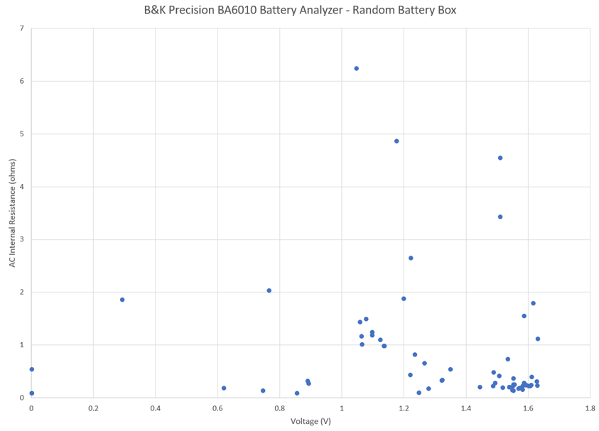 Another experiment I ran was a simple screening experiment, testing new AA batteries fresh from the packet and testing AA batteries in a “random batteries” container whose status was unknown. Using the R-V mode and the manual data sampling mode, the cells were placed inside a low-cost battery holder which undoubtedly contributed slightly to the internal resistance reading.
