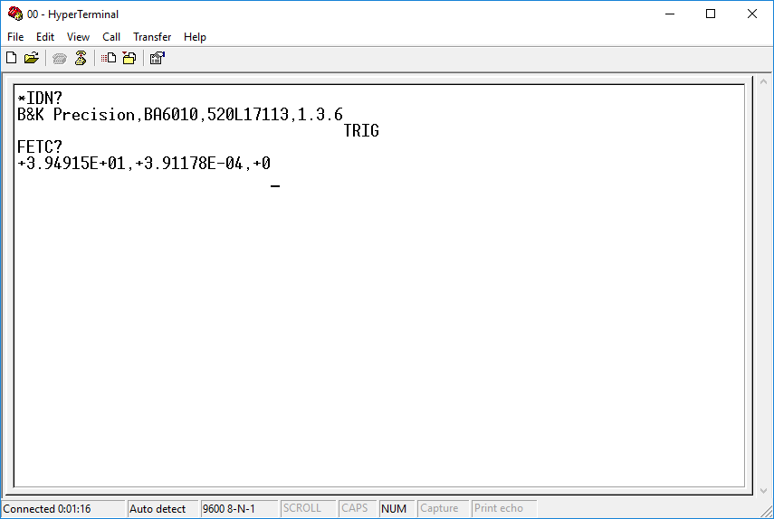 While reading throughout the programming manual, it seemed that the functions covered most of the capabilities of the BA6010 with the exception of being able to return the raw measurement readings. On the display, these measurement readings can be toggled, but show up as Vm and Im representing the measured 1Khz AC voltage and current injected. I have enquired with B&K Precision but have not heard anything in regards to this. I also noticed that out-of-range readings which display with hyphens on the screen actually return numeric values not directly related to the actual value, so readings of >3.5kΩ to 12kΩ means “out of range”.