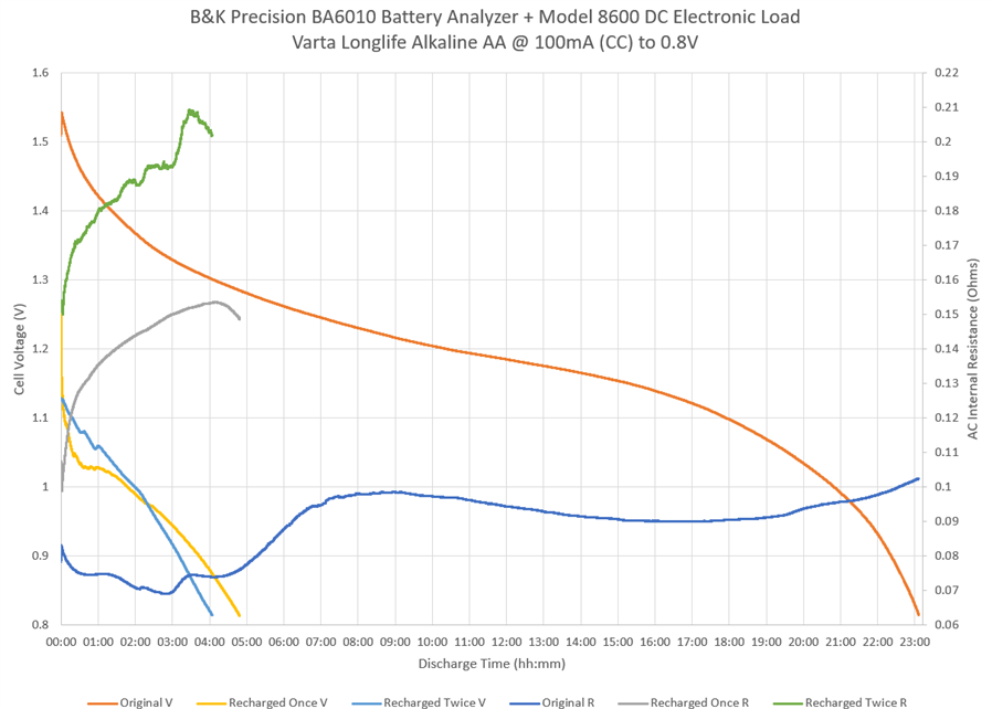 It is noticeable that the internal resistance of the cell increased by around 50% each time it was recharged. Despite this, the AC internal resistance change was not quite as large as I had expected, which may be related to how the battery responds to high frequency loads rather than low-frequency loads where DC internal resistance is expected to show even greater change. However, the actual cell performance under the 100mA CC test load was quite poor after recharging, which suggests that the Varta Longlife Alkaline AA cells are not highly amenable to recharging.