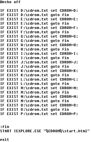 As my CD-ROM drive is R:, it never found the disc. It would also falsely detect a drive if it had cdrom.txt in its root directory. It also attempts to call Internet Explorer, so I suspect there’s a lot of improvements that can be made – perhaps using fully relative drive paths instead.