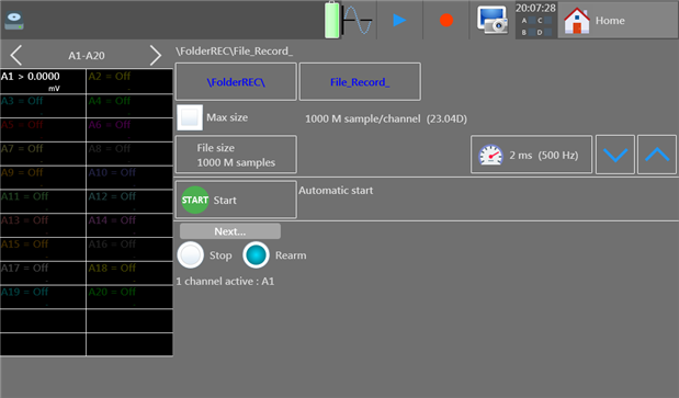 The trigger option from the home screen allows for the configuration of recording settings and recording triggers. Within the configuration settings include the ability to set a folder in which recordings are made and the file-name prefix for each file. Each file can be limited to a certain number of samples, with numerical input being made using an on-screen keyboard. Note that the number 2 on the keyboard is slightly out of alignment, which irks me slightly. The recording sample rate can be selected from a menu of options, with inappropriate values greyed out. The trigger options allow for setting of conditions on when to start a capture (e.g. on a date/time, on certain conditions of input) and what to do after the recording finishes.
