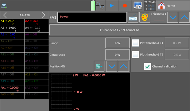 Ordinarily the unit will boot into the F(t) graphing mode, which emulates the display of a chart recorder scrolling new readings on the graph from right to left. The interface features a toolbar at the top with recording indicator, power, playback, record, screenshot, time and alarm channel indicators. Towards the right side of the screen are buttons including home and configuration for the display including screen setup, configure custom pages, freeze screen, full screen and timebase.