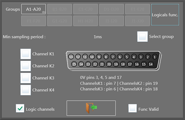 A separate set of menus is used to toggle channels on and off, with some options only appearing once the channels are enabled. Analog channels are grouped by the module, with the possibility to enable or disable a whole group. Logicals func. Button changes over to the second menu allowing for timing channels (K) to be enabled or disabled. The Logic channels tick-box at the bottom enables or disables digital input channels, while the Func valid checkbox actually enables or disables the mathematical function channels (which performs basic math between functions). Because of poor localisation, this was more confusing than expected.