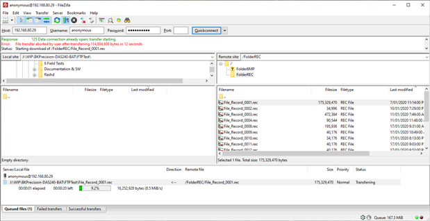 The device offers an unencrypted FTP server on Port 21 for more flexible file management, permitting the downloading, uploading and deletion of files via an FTP client or through the operating system. Testing of FTP functionality was done with FileZilla.