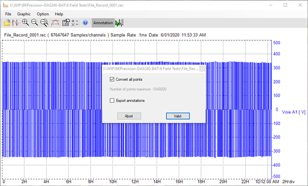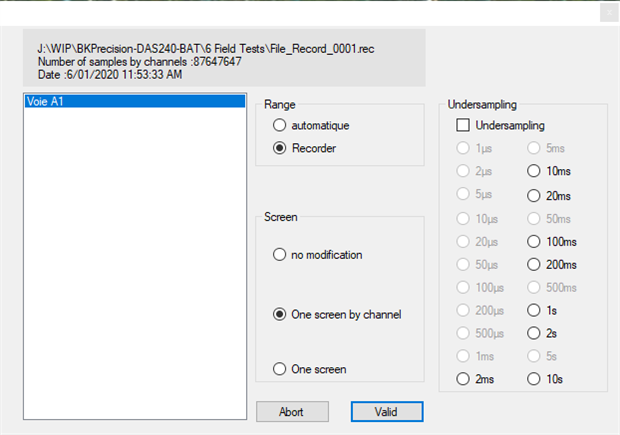 While loading a file, it is possible to configure several options including the range, whether each channel is plotted overlaid over another or on an individual plot and the ability to “undersample” the input file (i.e. decimate) to reduce the data volume. Note the extensive use of “Abort” and “Valid” instead of cancel and OK. The loaded data is displayed in a scope-trace like display.