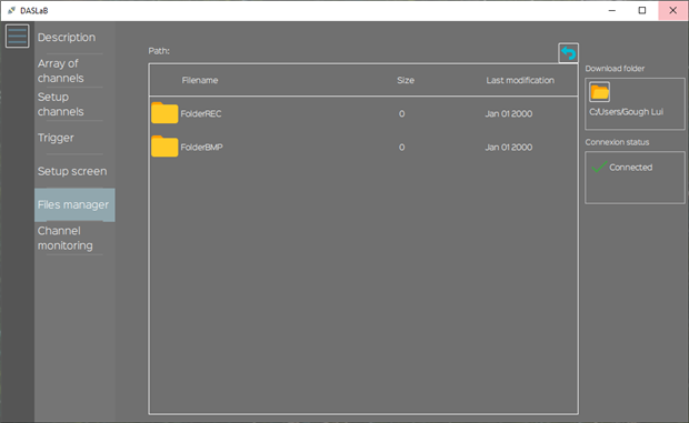 The “Setup screen” menu allows for the configuration of the number of display screens and the inclusion of a given channel onto one of two custom screens. The “Files manager” option connects to the unit via FTP, allowing for files to be downloaded to the computer.