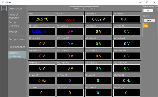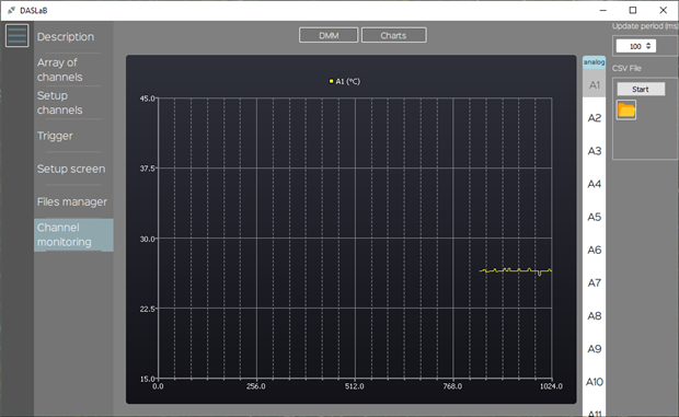 The “Channel monitoring” feature polls the recorder for values every update interval (set to 100ms by default) and either shows it on a numeric display (labelled “DMM”) or plots it locally on a chart. This is different to viewing the display remotely via VNC, as this retrieves the actual measurements and plots them rather than retrieving the screen as displayed on the unit.