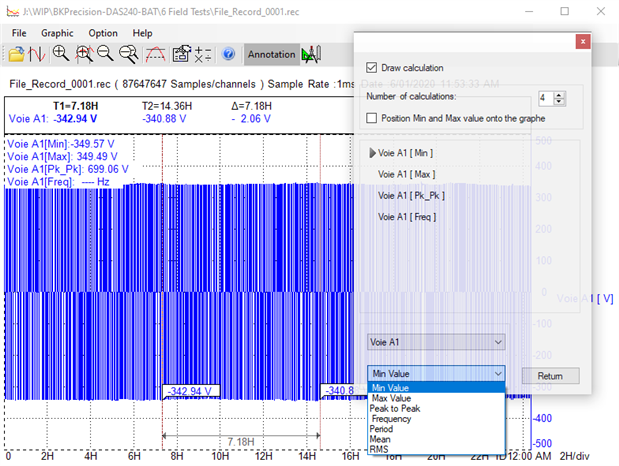 It is possible to make measurements on the data using cursors and calculation features. It is also possible to add annotations to the graph, which can be saved and exported. Some of the menus are oddly transparent for some reason.