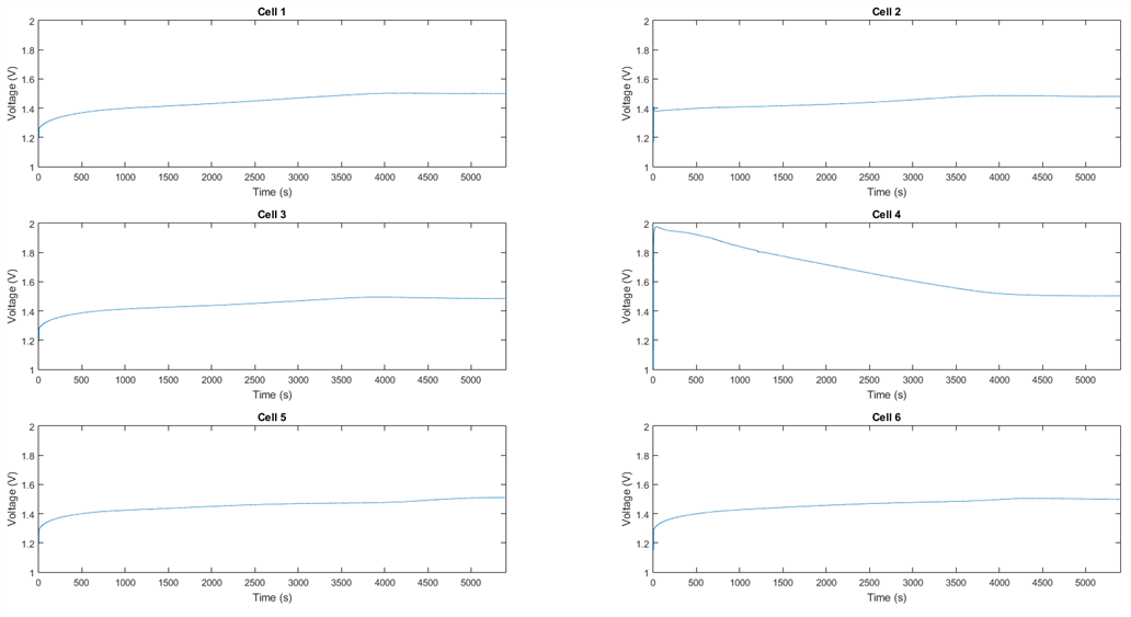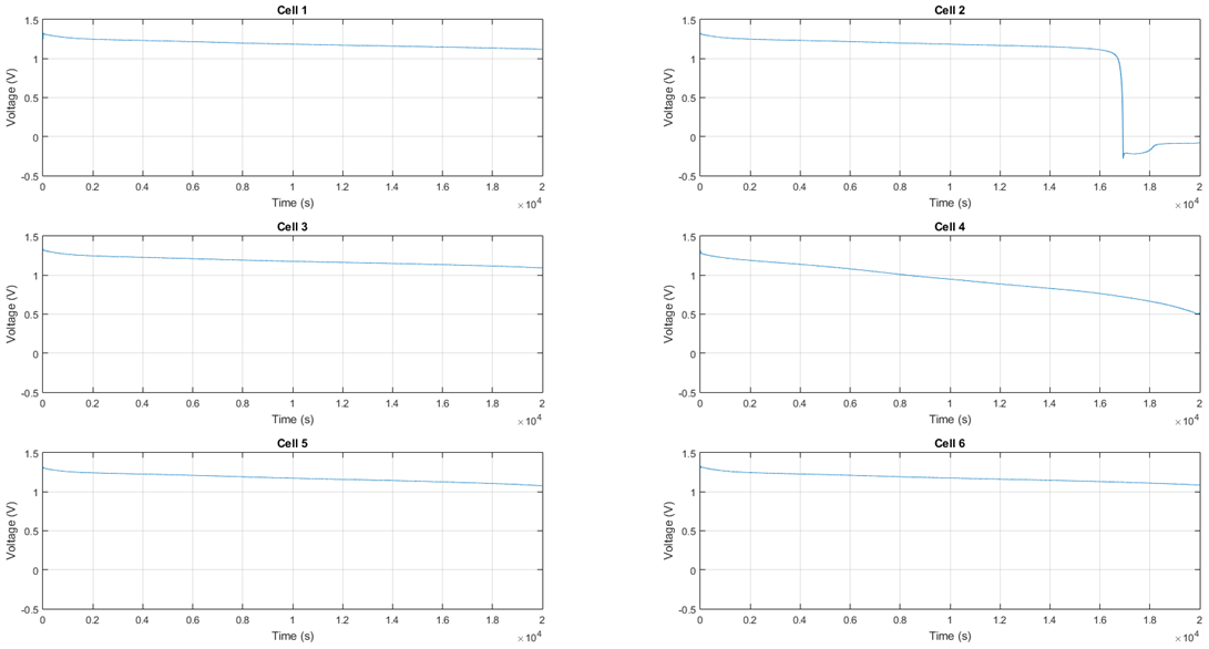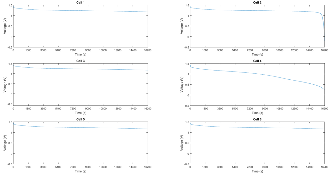 This one shows an overall voltage trend that looks surprisingly like a healthy pack, however, a look at the individual cell plots show that Cell 2 has just reached reverse polarity at the end of discharge and Cell 4 had reached very close to zero volts. This shows how the behaviour of the pack can very much be influenced by the “balance” of the charge in each cell.