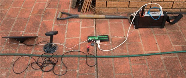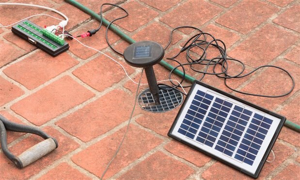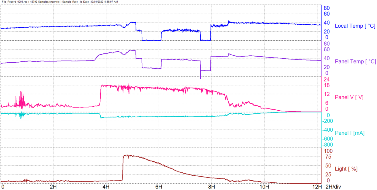 The unit was placed outside in the backyard, with the unit in a semi-shaded location, screen facing away from the sun in the shade (as direct sun would likely cause heat damage to the LCD). The channel interface was placed on the ground, thus liable to direct sunlight. One of the temperature channels measured the solar panel temperature, while the other was in the air near the channel interface to read the “local” air temperature.