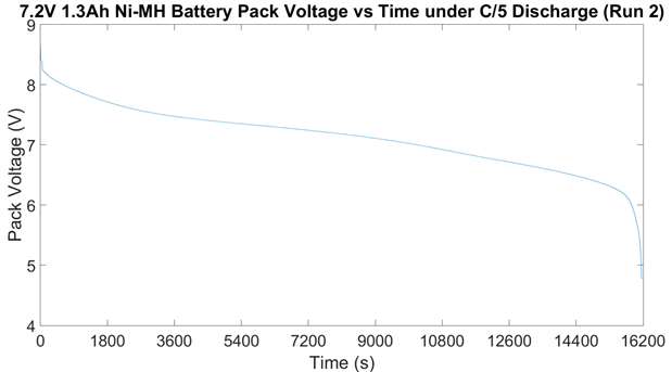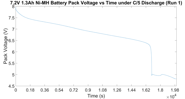 The cell was initially float-charged by the vacuum’s internal circuitry (likely, just a current limiting resistor). On a discharge, the overall voltage looks like the following graph:
