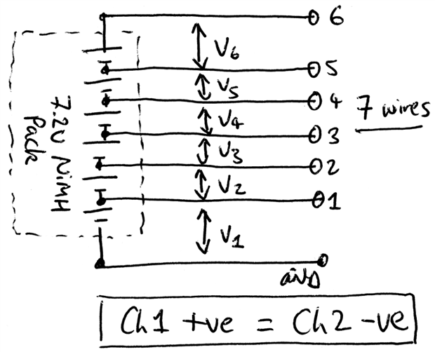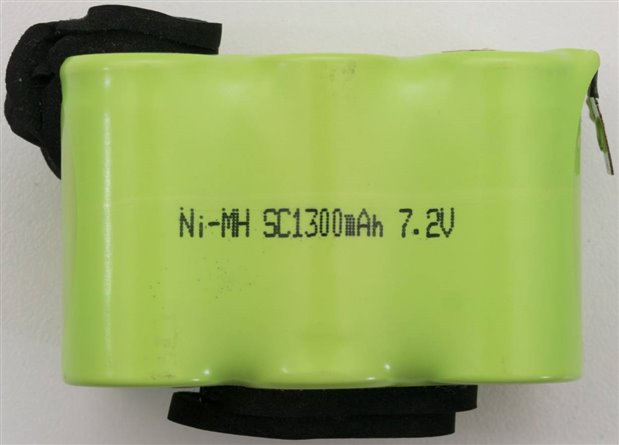 The battery comprises of six sub-C cells in series, for a nominal voltage of 7.2V and capacity of 1.3Ah. To monitor the battery while charging and discharging, I determined that there should be seven wires to the pack.