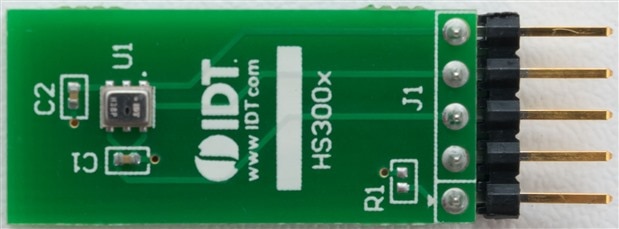 A look at the HS3001 humidity and temperature sensor board shows the bare minimum of components – just the sensor package with two bypassing capacitors is all that is needed. An optional R1 position is supplied, but its purpose is not known – perhaps for presence detection?
