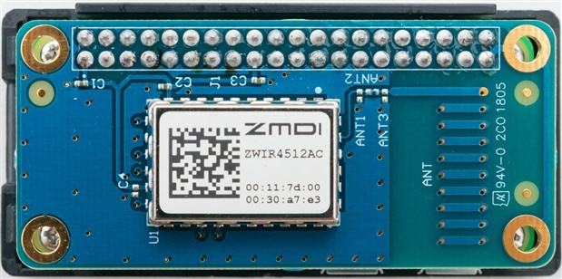 The IDT SDAWIR03 hub is built around a Raspberry Pi Zero-W with a custom-built “hat” utilising the surface mount ZWIR4512 module on a printed antenna coil. The module uses the UART for communication with the Raspberry Pi. The PCB appears to be poorly manufactured, with registration issues between the drill layer and the copper/silkscreen/solder-resist layer. The connector appears to have been hand soldered, although fairly well. The unit uses a Sandisk Edge 8GB microSD card for storage.