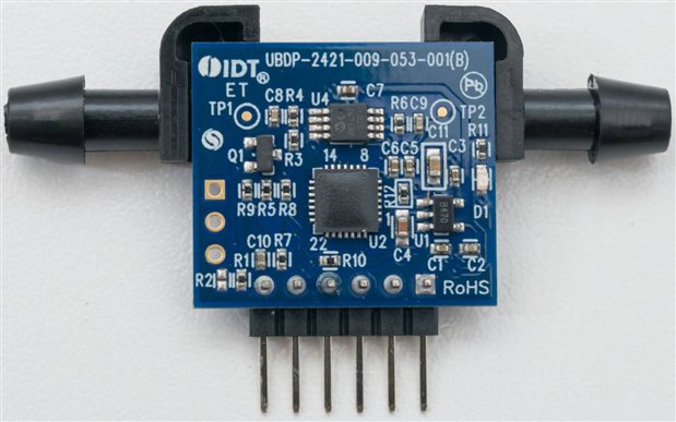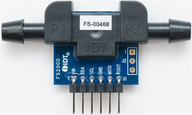 The two sensors plug into the board, although the orientations are not clearly marked. The HS3001 has a very simple PCB which only features two de-coupling capacitors, whereas the FS2012-1010-NG features a more complex PCB with a 28-pin IC lacking identification and a number of other supporting components. The flow sensor uses barbed fittings to connect to a gas flow moving from P1 to P2. It has an unused analog output and a seemingly unreferenced J2 connector.