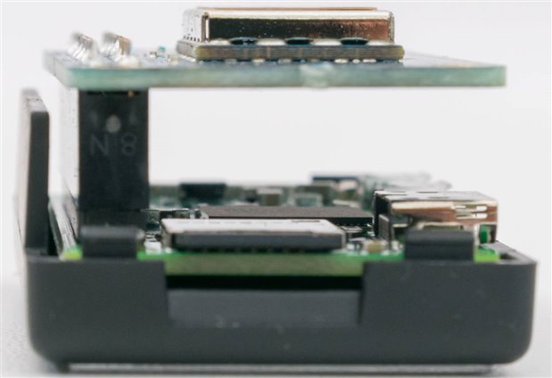 The hat sits elevated above the board due to the height of the header connector, which allows for additional separation of the antenna from the board reducing interference potential. This is, however, bringing the board closer to the metallic labelling on the case, which may affect its sensitivity and range.