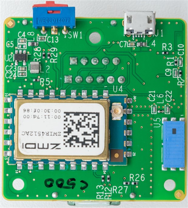 A close look at this board shows that it uses a different form of the ZWIR4512 module – this type is on a castellated PCB with external antenna connector. In this case, the connector is left disconnected, and instead, a chip antenna is installed at U5.